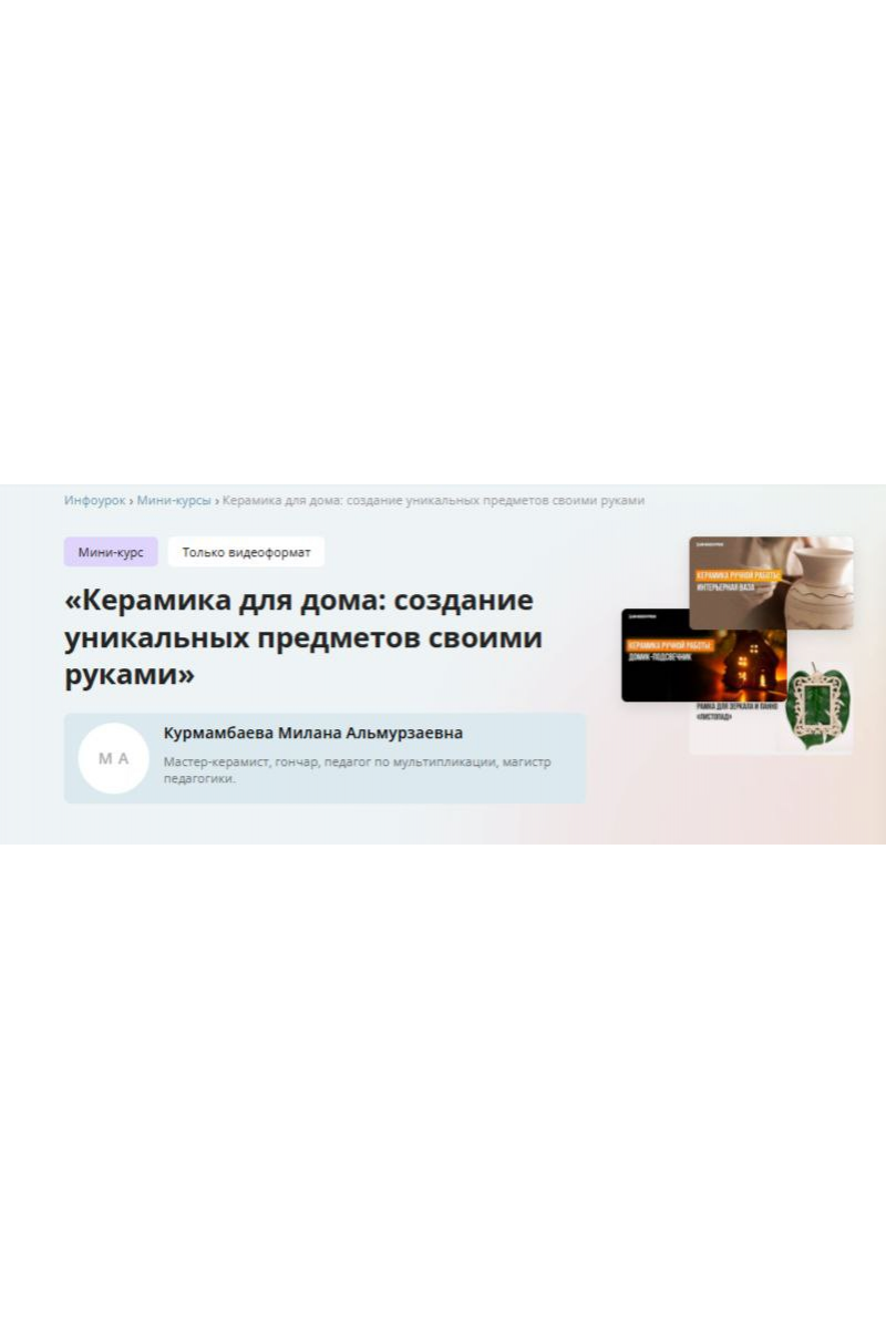 На этом курсе вы научитесь создавать стильные и уникальные керамические изделия, которые преобразят ваш дом. Вы сможете слепить вазы, домики-подсвечники и осенние панно, вложив в каждое изделие свои идеи и творчество. Этот курс — отличная возможность освоить керамическое мастерство и создать уютную атмосферу в своем доме с помощью оригинальных предметов, сделанных своими руками. *Материалы курса основаны на записях мастер-классов образовательного маркетплейса Инфоурок.