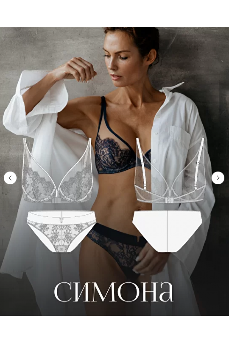 «Симона» — комплект нижнего белья, который состоит из бюстгальтера на низких каркасах с высокой чашкой и трусиков-бразильяно с разделителем.