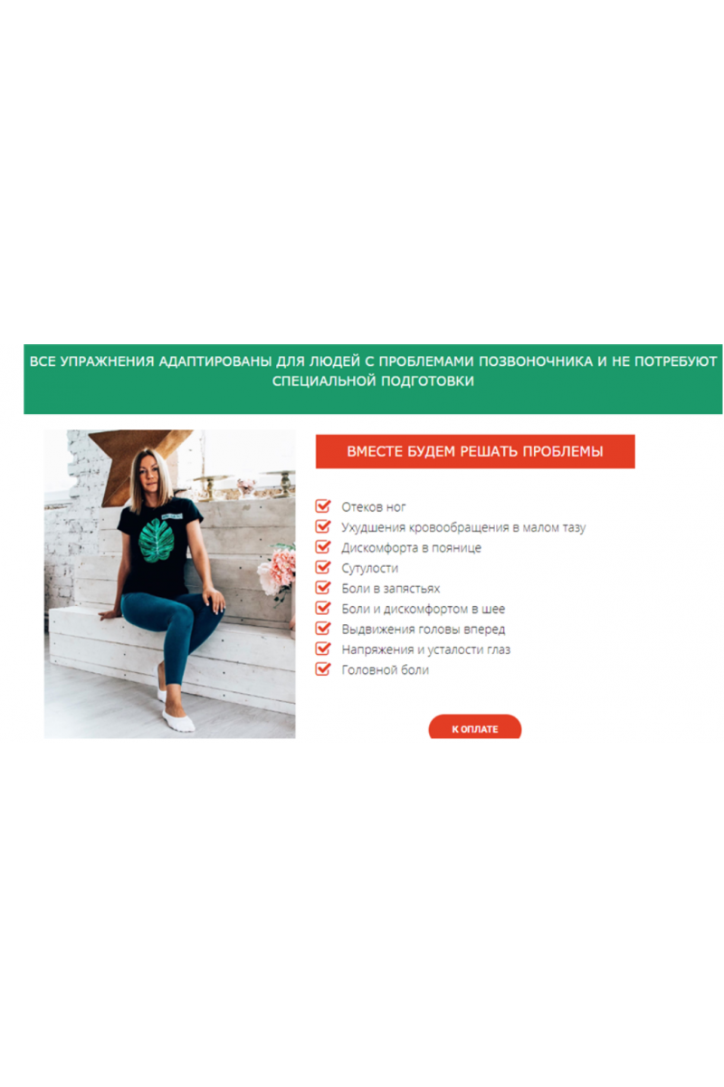 Все упражнения адаптированы для людей с проблемами позвоночника и не потребуют специальной подготовки.Дегенеративно-дисторофические изменения позвоночника не являются противопоказанием,но требуют строго соблюдать все рекомендации.