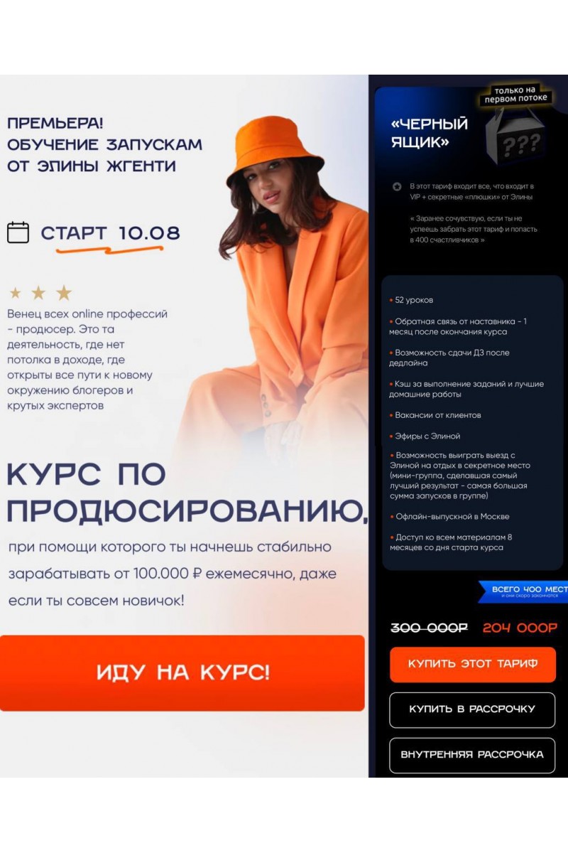 КУРС ПО ПРОДЮСИРОВАНИЮ,при помощи которого ты начнешь стабильно зарабатывать от 100.000 ₽ ежемесячно, даже если ты совсем новичок!Программа курса:МОДУЛЬ 0 - Как устроен курсМОДУЛЬ 1 (2 недели) - Старт запускаЧто такое запуски и как на них заработатьРоли в запусках: продюсер, эксперт и специалистКак выбрать нишу для запускаВиды инфопродуктов, которые можно запуститьЭтапы запуска: от поиска эксперта до подведения итоговКак определить бюджет и разделить доходы/расходы на запускеЗапуск с продюсером и без: что выбрать?Упаковка продюсера: что сделать прежде, чем предлагать партнерство экспертуПоиск эксперта для запуска: 10 работающих способовПереговоры продюсера и эксперта: правильная коммуникация и четкие договоренностиЮридическая безопасность: как сделать запуск, не нарушая законМОДУЛЬ 2 (2 недели) - Что продаемРаспаковка: кто такой эксперт и в чем его суперсилаАнализ ЦА: как найти свою аудиториюДекомпозиция: как запланировать количество продажДорожное руководство: как выбрать продукт и не ошибитьсяАнализ конкурентов: пошаговый план действийКак создать обучающую программу, которая будет продавать сама себяПостроение образовательной среды с вау-эффектомКак обучать, чтобы ученики получили результат и стали вашими кейсамиЗапись уроков, как качественно снимать без бюджета и с бюджетом.Как создать качественные материалы к курсуМОДУЛЬ З (3 недели) - Как продаемЭкологичный прогрев: как продавать легко и с удовольствиемКак вести блог, чтобы сторис и посты ждали больше, чем новую серию от NetflixКонтент-план: внедряем в блог то, что распаковалиИнфоповоды и сторителлинг: как продавать через историиКак чередовать контент в течение дняТриггеры: как побудить клиента к покупкеКак писать продающие текстыФишка прогреваЧто такое воронка продаж и как она работает. 7 видов воронок.Диагностика — друг или враг?Воронка продаж через бесплатный вебинар. Разбор.Техническая настройка вебинара: бесплатные и платные сервисыПодготовка сайтов и платежных системСтруктура презентации продуктаКак обрабатывать заявки, чтобы не ушел ни один клиентМОДУЛЬ 4 (2 недели) - Кому продаемКак упаковать аккаунт, чтобы подписывались, даже когда вы не выходите в сторисЛичный бренд и аутентичность: как быть собой в блоге и в жизниАлгоритмы Reels: как попадать в топ и создавать трендыГде брать идеи для видео и как писать сценарииМузыка, текст и грамотный монтаж для ReelsКак за день снять и смонтировать видеоконтента на месяц впередКак через Reels набирать аудиториюДругие бесплатные способы набора аудиторииПлатные способы набора аудиторииАналитика в Инстаграме: как отслеживать метрики и корректировать стратегиюМОДУЛЬ 5 (0,5 недели) - Финал запускаКак подвести итоги запуска и поставить более высокую планку на следующийКак правильно оформлять кейсы запусков, чтобы они продавали за вас