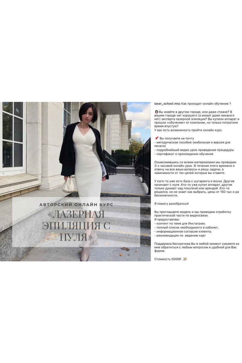 ⠀ Ознакомившись со всеми материалами мы проводим 3-х часовой онлайн урок .В течении этого времени я отвечу на все ваши вопросы и решу задачи, в зависимости от тех целей которые вы ставите. ⠀ У кого-то уже есть база с шугаринга и воска .Другие начинают с нуля .Кто-то уже купил аппарат, другие только думают над покупкой или арендой .Кто-то решился, но не знает как выбрать, цены от 150 тыс и до бесконечности. ⠀ Я помогу разобраться! ⠀ Вы приглашаете модель и мы проводим отработку практической части по видеосвязи. Я предоставляю: - контент по теме для Инстаграм; - полный список необходимого в кабинет; - информационное согласие клиента; - рекомендации по ведению карт