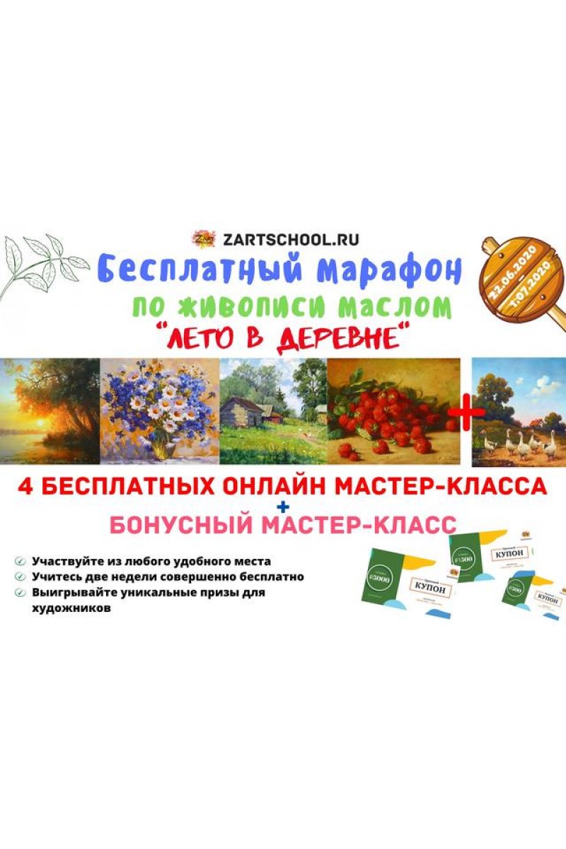 Онлайн марафон – это 5 мастер-классов в прямом эфире, на которых вы научитесь писать 5 картин маслом. Каждое занятие доступно в записи 24 часа, что позволяет участникам иметь время на анализ записи и дописывание картины.