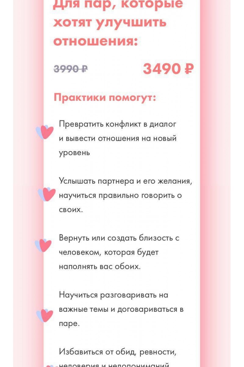 Авторские медитации sorvette для пар и тех, кто в поиске партнёра.Если вы чувствуете потребность в большем количестве любви — вы оказались в правильном месте. Полюбите себя, найдите мужчину мечты, постройте счастливые отношения,просто медитируя 15 минут в день...Регулярные медитации запускают работу с подсознанием и помогают докопаться до неэффективных убеждений, а значит — выбраться из негативного сценария.Как работают медитации?Практики направлены на раскрытие сердечного энергетического центра.Почему так важно с ним работать?Сердечный центр отвечает за принятие себя и других, коммуникацию, любовь, эмпатию, понимание, заботу, сострадание.В этих чувствах и эмоциях кроется колоссальный ресурс!И это база – основа, на которой строятся гармоничные отношения: с собой, с партнером, со всем окружающим миром!Пока сердечный центр закрыт, заблокирован, в вашей жизни постоянно возникает непонимание. Вы не можете договориться и не можете отпустить обиды!Медитации помогут восстановить баланс и гармонию внутри и решить эти проблемы.Так же бонусом я проведу для вас вебинар со своим телесным терапевтом.Татьяна помогла лично мне и десяткам других клиентов избавиться от блоков и зажимов, которые не позволяли чувствовать себя по-настоящему уверенной, сексуальной и привлекательной.Терапевт сделает для вас подробный гайд, по которому вы сможете работать со своим телом самостоятельно, и ощущать себя лучше и лучше.
