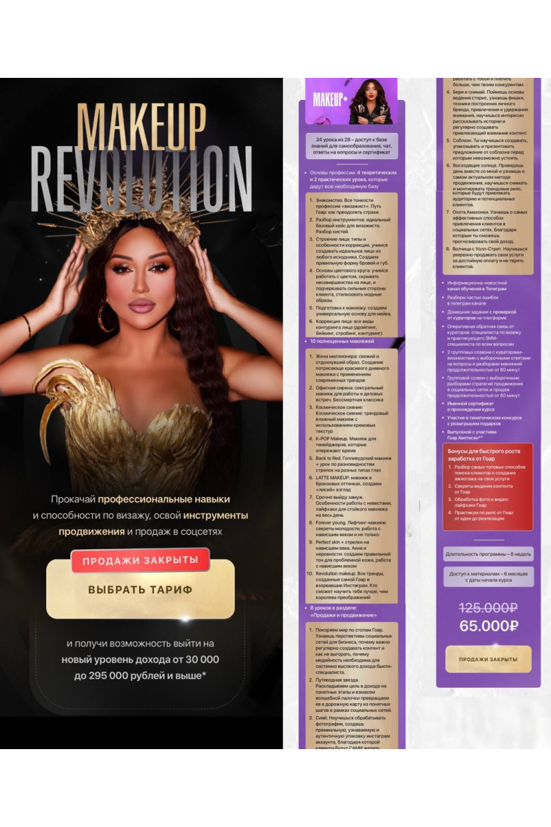Прокачай профессиональные навыкии способности по визажу, освой инструменты продвижения и продаж в соцсетях.24 урока из 28 – доступ к базезнаний для самообразования, чат, ответы на вопросы и сертификат