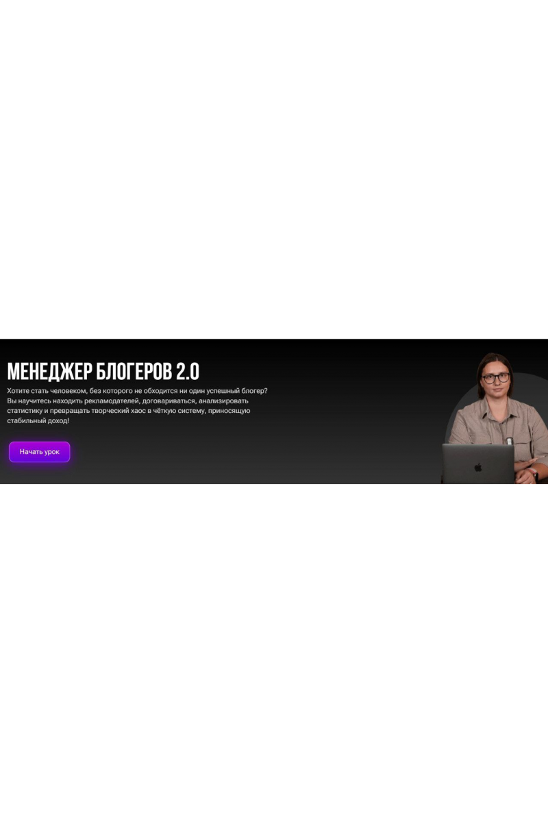 20 занятий, на которых Ольга Бурдейная не просто рассказывает «как круто быть менеджером», а раскладывает профессию на конкретные шаги. От первого неловкого «а что вы вообще делаете?» до момента, когда вы сами диктуете условия и рекламодатели соглашаются, потому что чувствуют: с вами — надёжно.