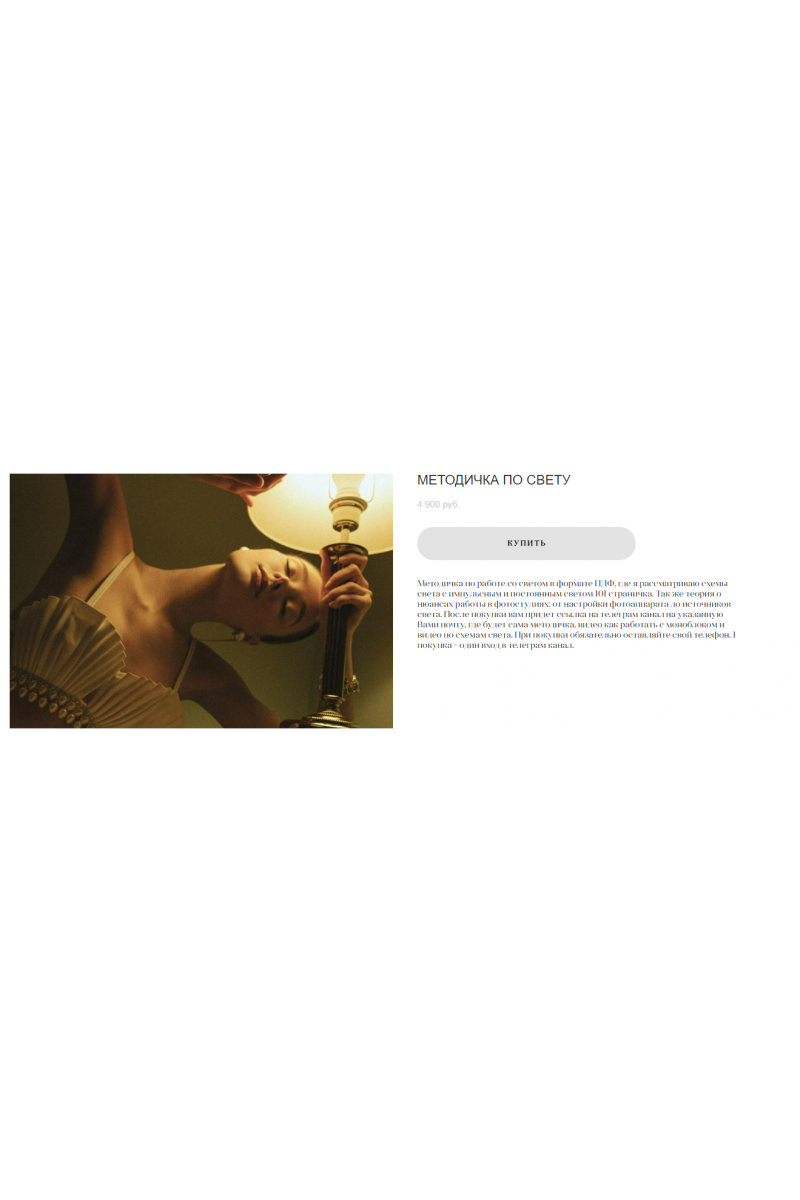 Методичка по работе со светом в формате ПДФ, где я рассматриваю схемы света с импульсным и постоянным светом 101 страничка. Так же теория о нюансах работы в фотостудиях: от настройки фотоаппарата до источников света.