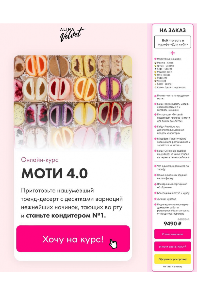 14 начинок:Лаванда - черная смородинаСмородина - лимонБанан - шоколадФисташка - малинаКлубничное мороженоеСочные тропикиЧерничный коктейльМолочный ломтикОреоДвойной цитрусТирамисуМаковый лимонВишневый поцелуйМалиновый коктейль9 бонусных начинок:Малина - КокосГруша - ДорблюКофе - БейлисМедовая дыняПина коладаРафаэллоСникерсКрем - брюлеКрем - брюле с медовиком6 видов рисового тестаДекор "Зверята"Полная вводная лекция о мотиТаблица себестоимости каждого мотиЧек-листы по ингредиентам и инвентарюМастер-класс по фуд-съёмке мотиГайд по упаковке мотиГайд по декору мотиГайд «Как внедрить моти в свой ассортимент и готовить на заказ»Инструкция «Готовый пошаговый прогрев на моти для ваших соц.сетей»Гайд «FlowWow как дополнительный канал продаж кондитера»Гайд «Основные ошибки кондитера: на каких этапах вы теряете свою прибыль.»