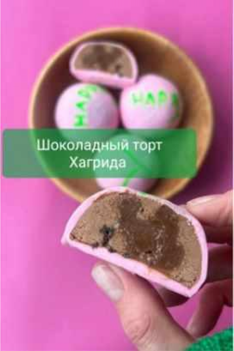 Начинка Моти «Шоколадный торт Хагрида» из коллекции «Гарри Поттер»: основа - мусс на сливках и шоколаде (молочном и темном), жидкий шоколадный центр и шоколадное хрустящее печенье.