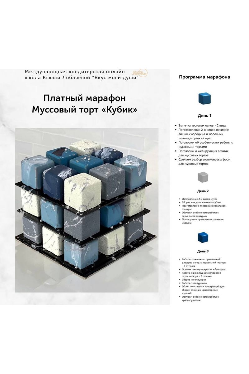 На марафоне Муссовый торт «Кубик»: изготовим 25 кубических пирожных и соберем в торт; научимся делать 2 вида основ, 2 вида муссов и 2 вида прослоек; освоим два вида покрытия: гляссаж и шоколадный велюр; изучим технику покрытия «Леопард»; научимся работать с краскопультом; узнаем, как стабильно собирать сложные конструкции и поговорим о хранении муссовых изделий.
