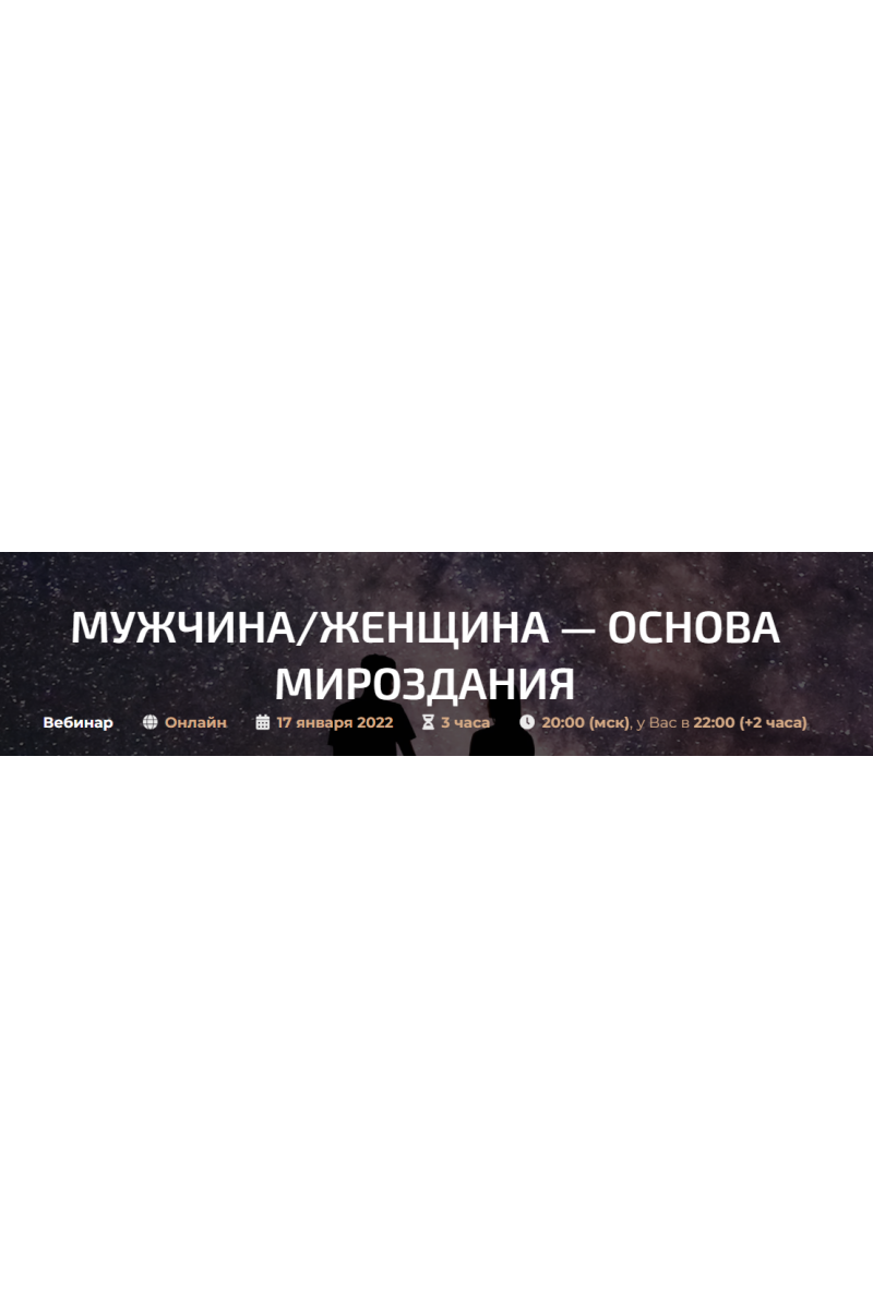 Как бы там ни было, мы будем на Вебинаре разбирать многое, связанное с Мужчиной и Женщиной: это и отношения, и бизнес, секс, дети, как это ни удивительно, государственность, политика, экология, вопросы болезней, ураганов, засух, землетрясений и войн.