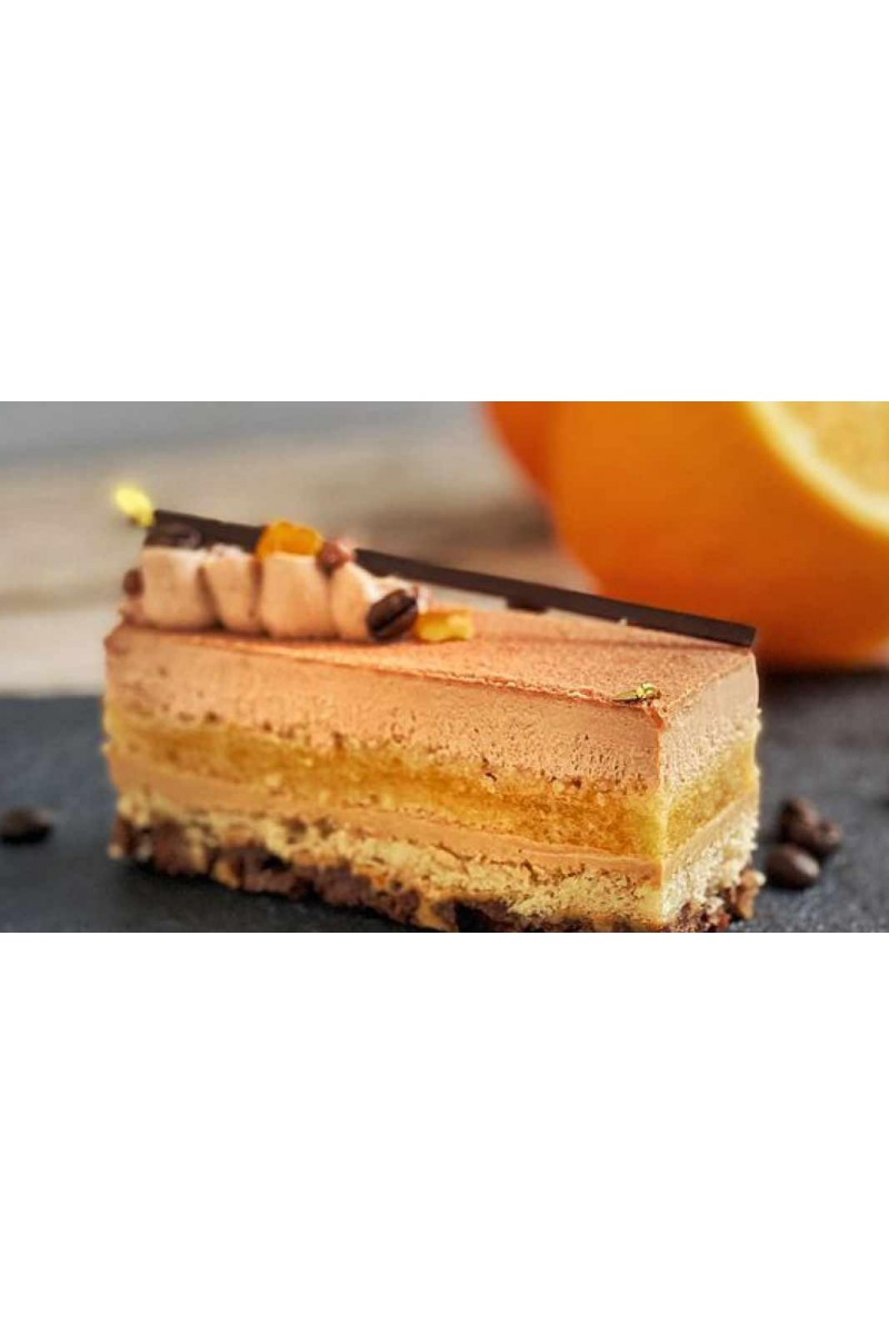 Кофейный бисквит без масла, кислинка апельсинового мармелада, шелковая кофейная намелака, мусс на молочном шоколаде и взбитый ганаш дополнены задорным хрустом вафельного слоя