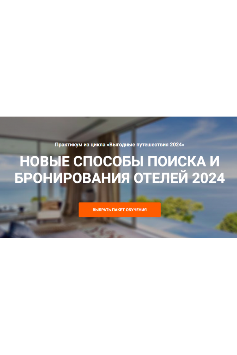 После прохождения основного, базового курса по отелям и 1-го несложного задания - Вы бесплатно получите особые, продвинутые способы поиска отелей, которыми пользуются только самые опытных путешественники. Чтобы жить даже в 5-ти звездочных отелях по всему миру и в России со скидкой до 70% - это реально!