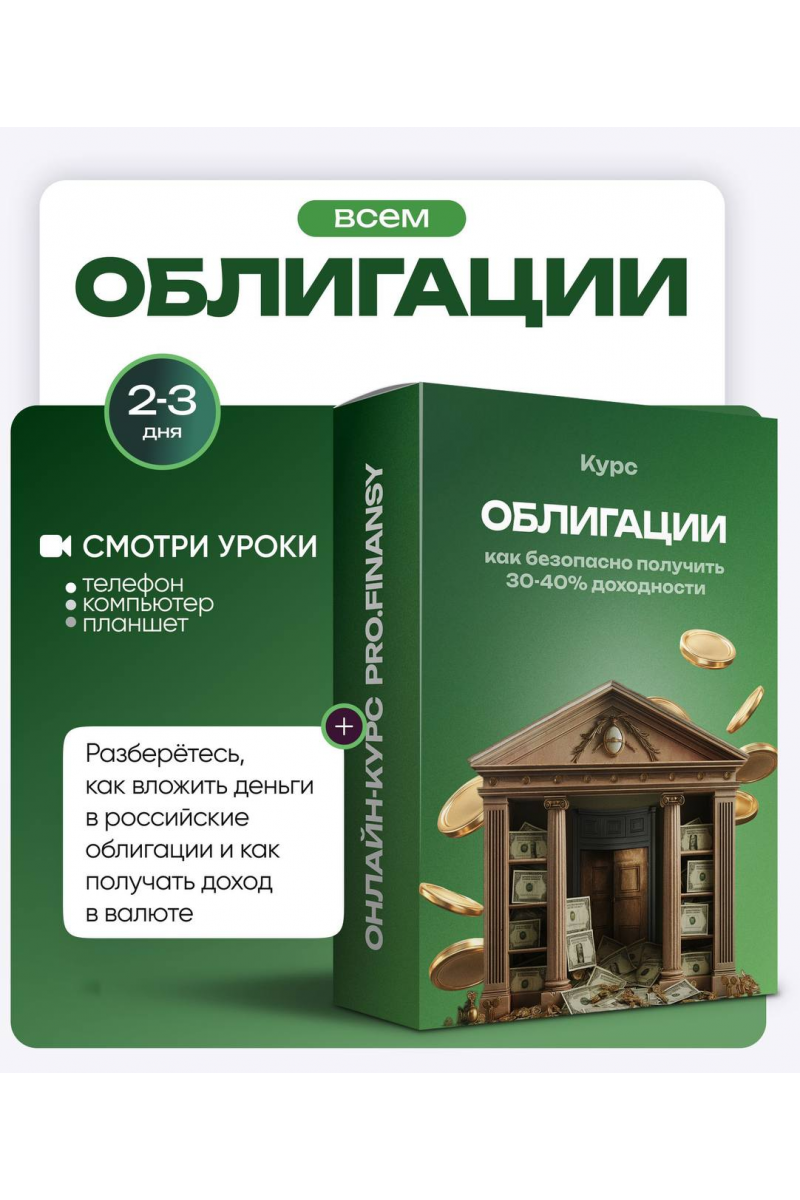 Вы узнаете, что такое облигации и как на них можно заработать 30-40% доходности надежными способами. Вы разберётесь, как вложить деньги в российские облигации и как получать доход в валюте. Вы научитесь выгодно и без ошибок выбирать облигации в свой портфель. Курс записан преподавателем pro.finansy.