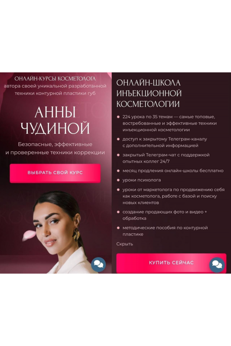 ОНЛАЙН-ШКОЛА ИНЪЕКЦИОННОЙ КОСМЕТОЛОГИИ224 урока по 35 темам — самые топовые, востребованные и эффективные техники инъекционной косметологиимесяц продления онлайн-школы бесплатноуроки психологауроки от маркетолога по продвижению себя как косметолога, работе с базой и поиску новых клиентовсоздание продающих фото и видео + обработкаметодические пособия по контурной пластикеАННА ЧУДИНАВысшее медицинское образование, 2 интернатуры и 4 специализацииАвтор своей уникальной разработанной техники «плоский бантик»Более 100 пройденных курсов по обучению и по повышению квалификации, участие в конгрессах и конференцияхБолее 7 лет работаю в качестве врача инъекционной медицины, полная запись на 3 месяца впередСвыше 10 000 довольных клиентов и 450 востребованных, конкурентоспособных специалистов, которых я обучила в своей онлайн-школе