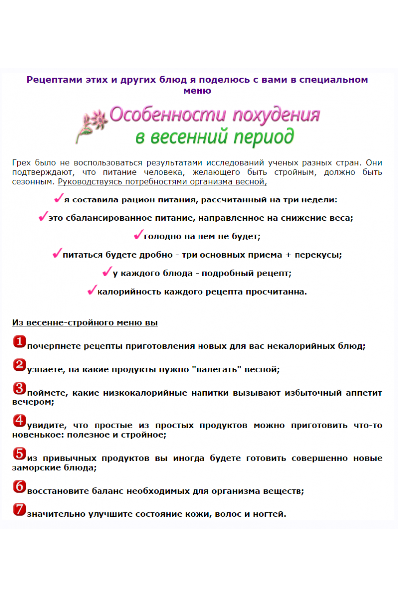 + Как я уже обещала, вместе с меню "Особенности похудения в весенний период" вы получите таблицу. В ней - что есть и пить в основные приемы пищи и перекусы, а что перед сном. А так же колонка-список продуктов на каждый день. Ничего экзотического, как я уже говорила. Эту таблицу можно распечатать и повесить на видное место для полного комфорта процесса похудения!