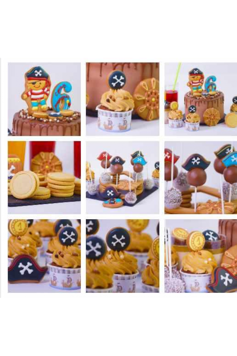 - Пряничные украшения: топпер “Пират”, “Цифра именинника”, “Пиратские шапки для кейкпопсов”, “Монеты для капкейков”, “Пиратские метки для капкейков”)