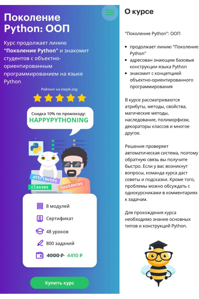 Курс продолжает линию "Поколение Python" и знакомит студентов с объектно-ориентированным программированием на языке Python