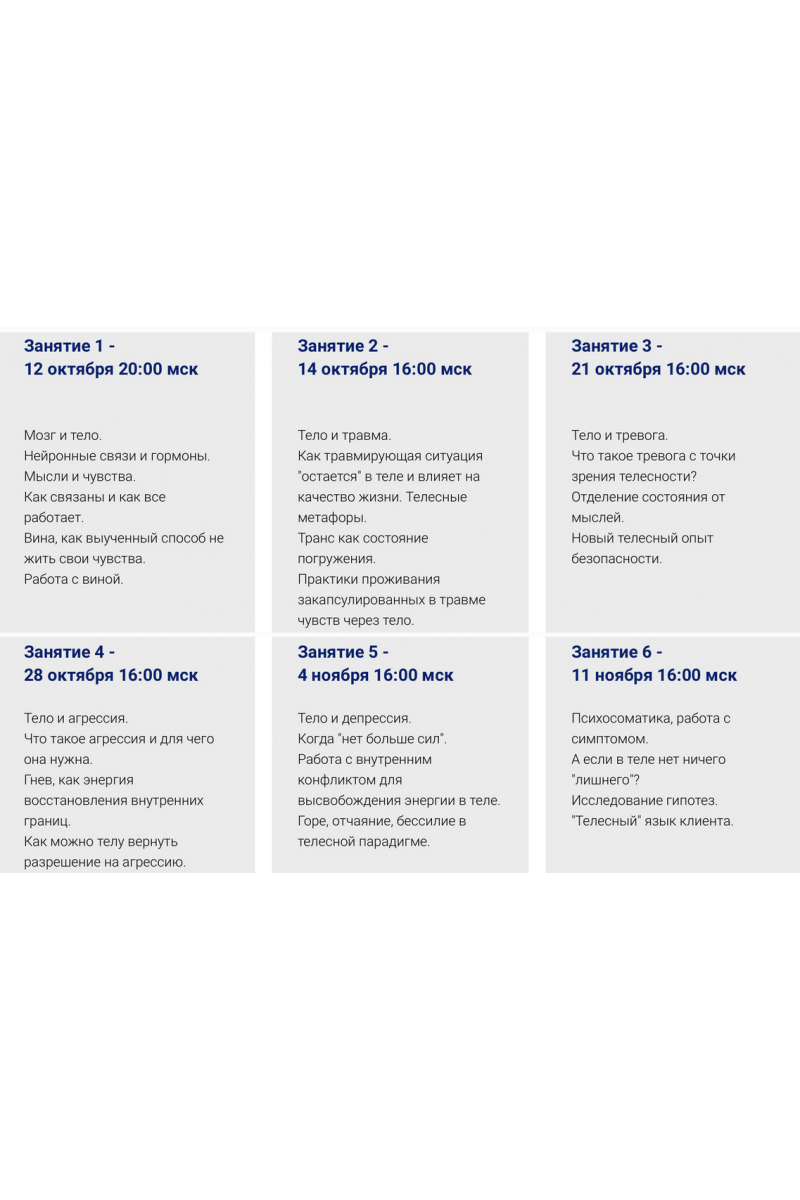 На встречах вас ждет теория и практика работы с переживаниями через тело. В перерывах между встречами - общий чат для обсуждений домашних заданий, своих процессов, наблюдений, инсайтов