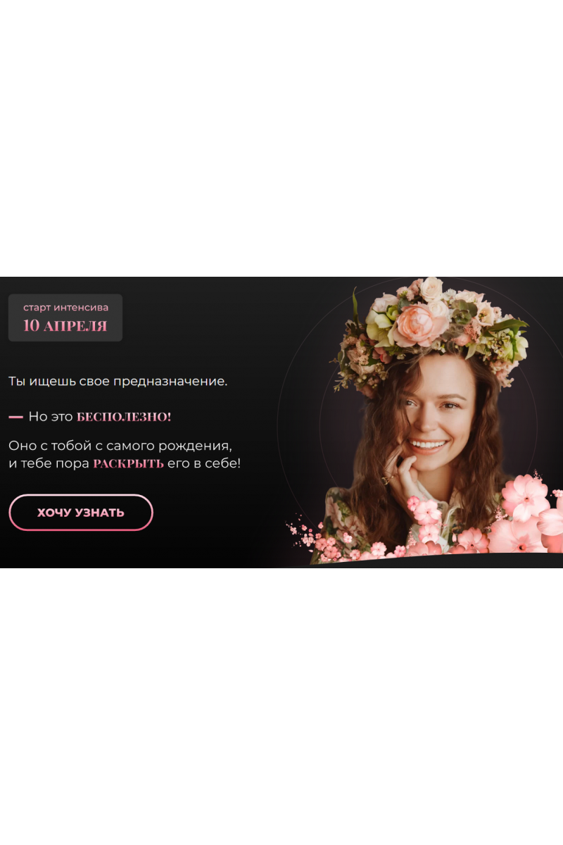 Моя миссия – чтобы КАЖДАЯ женщина нашла СВОЁ дело жизни. Каждая зажженная звездочка распространяет свой свет на десятки людей вокруг, делая мир лучше, счастливее, изобильнее! Ты готова выпустить свой дар, спрятанный глубоко внутри, и засиять для всего мира? Готова заниматься ЛЮБИМЫМ ДЕЛОМ, и главное, ЗАРАБАТЫВАТЬ? ТОГДА Я ЖДУ ТЕБЯ НА ИНТЕНСИВЕ «ПРЕДНАЗНАЧЕНИЕ»