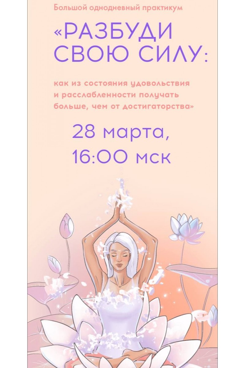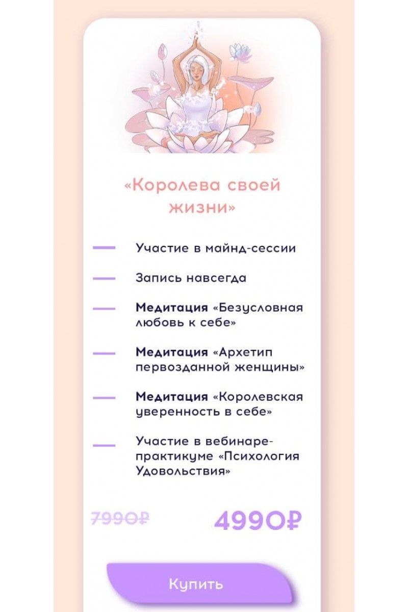 Научись получать результаты через удовольствие, а не через суровую гонку на пределе сил.Перестань чувствовать себя загнанной лошадью и все тащить на себе.Обрети свободу делать, что хочешь; выглядеть, как хочешь, решать, что для тебя лучшеТы выросла в мире, где царят мужские законы.Где с самого детства учат:— достигать, а не созидать— действовать, а не чувствовать— пользоваться логикой, а не интуицией— контролировать, а не доверятьТы выросла в мире, где царят мужские законы.Где с самого детства учат:Делай так и будешь успешна, богата и счастлива.Но единственный приз, который ты получишь в этой гонке за результатом, — выгорание, опустошение или депрессия.Я знаю, о чём говорю, потому что сама так жила. Выгорала, лежала пластом, поднималась через не могу и на последних зарядах батарейки перла вперёд. Чтобы быть лучше всех, чтобы доказать всем, что я чего-то стою.А потом открыла для себя знания о женской энергии и все изменилось.Теперь я хочу передать тебе эту инструкцию по пользованию женской сущностью.Тебя с детства учили, как быть хорошей матерью, верной женой, домовитой хозяйкой. Учили, что раз ты женщина, то твоя миссия — отдаватьЦель майнд-сессии — разбудить ту другую силу, которая дана самой Вселенной по праву твоего рожденияНо истинная женщина — это Королева, которая дает если сама хочет и берет все, что нравится.Пора всё исправить!Ты забыла, кто ты есть на самом деле. И вот, что происходит:Постоянное фоновое недовольство собой, своими результатами и внешностью.В жизни нет места спонтанности. Живешь однообразно, по установленному порядку, а все, что не по плану — нет, спасибо.Живешь с оглядкой: одобрят ли мой внешний вид родители, что скажут друзья, понравится ли это моему партнеру?Созависимые отношения — твой постоянный сценарий. Если не все, то очень многое, делаешь ради него и для него.Шутка про бессмертного пони для тебя — каждодневная реальность. Вечная усталость и потухший взгляд — твои спутники. Где берешь силы, сама не знаешь.Постоянно сравниваешь себя с другими, конкурируешь и борешься. Не жизнь, а голодные игры.Все время чего-то суетишься, беспокоишься без причины о будущем, финансах, отношениях. Тревожный сырок — твое второе имя.Ощущаешь себя одинокой, иногда даже с друзьями и близкими.Забыла, когда последний раз искренне смеялась или плакала. Ты же сильная, сильные не плачут. Сдерживаешь эмоции и «держишь лицо» даже наедине с собой.Ловишь себя на том, что события и люди вокруг чаще раздражают, разочаровывают и злят, чем наоборот.Быт задолбал, рутина поглотила, кажется, это будет всегда.Мы задействуем три уровня: физический, эмоциональный и интеллектуальный.Что даст тебе участие в майнд-сессии сразу, и что ты получишь после.Раньше я делала продукты, которые дают результат в моменте. Потом перешла на программы, которые работают в долгосрок. Ни то, ни другое нельзя считать по-настоящему эффективным.В первом случае нет задела на будущее, во втором нет мотивации продолжать, потому что ничего не происходит быстро.Эту майнд-сессию я построила так, чтобы ты вышла с неё совершенно с другим состоянием, а затем, повторяя практики, техники и медитации, получила устойчивый результат.Научишься расслабляться, жить без выгорания, действовать в потоке.Обретёшь целостность, внутреннюю уверенность и осознаешь свою женскую силу. Это исц