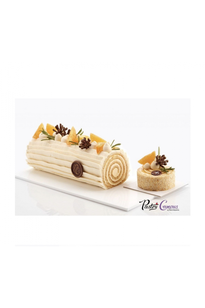 В случае с нашим рулетом “Мандариновый лес” мы максимально упрощаем себе задачу: используем очень гибкий и неприхотливый бисквит, а также крем, который легко поддается сворачиванию и не пытается убежать во все стороны. А благодаря тому, что слои максимально тонкие, сложностей возникнуть практически не может!