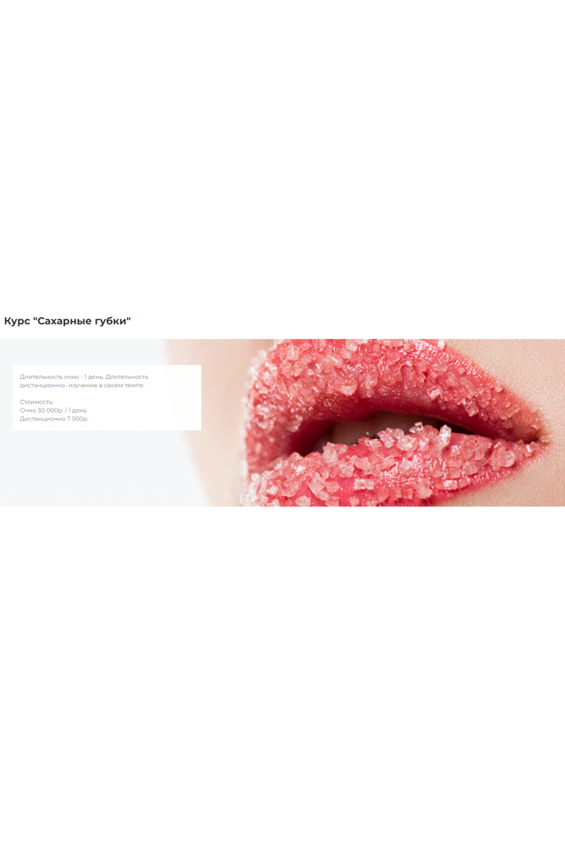 КУРС САХАРНЫЕ ГУБКИ Накаченные губы сегодня — один из самых модных трендов девушек, идущих в ногу со временем. А как научиться создавать такую красоту, вы узнаете на авторском курсе Сахарные губки. Курс Сахарные губки — это полное собрание самых современных на сегодняшний день техник, как увеличить губы. Стольких тонкостей, фишек и секретов, как сделать пухлые губы, вы не найдете больше нигде. За приемлемую цену вы получите такие знания, которые доступны только профессионалу с не менее чем 10-летним опытом работы в данной сфере. Мы учим делать губы дорого и утонченно, слой за слоем, как ювелир создает украшения. ДЛЯ КОГО ПРЕДНАЗНАЧЕН КУРС САХАРНЫЕ ГУБКИ Курс Сахарные губки будет полезен для: