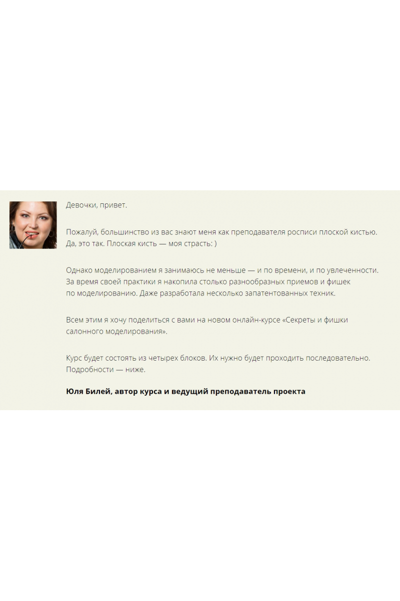 Этот курс для тех, кто работает в салонах. Для реально практикующих мастеров, которые не хотят застывать на месте, а хотят развиваться профессионально. Для тех, кто хочет узнавать новые приемы моделирования, хочет делать его быстрее и качественнее.