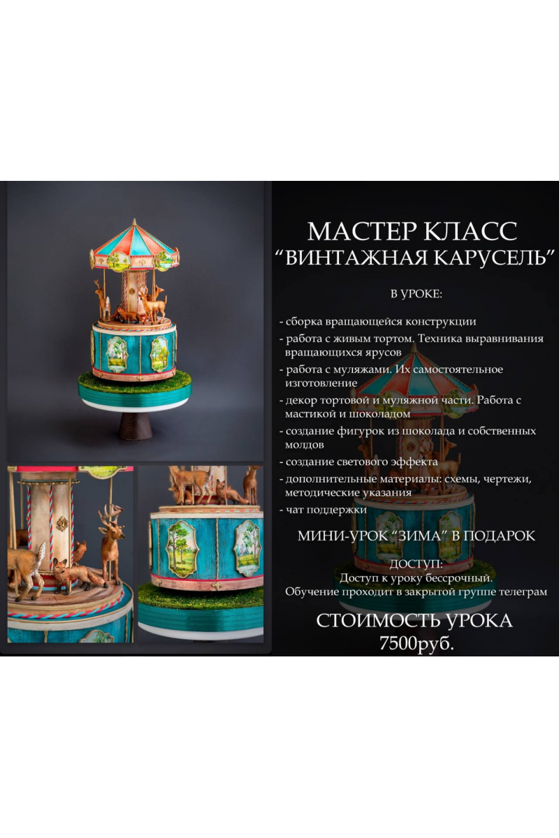 Шоу-торт «Винтажная карусель с лесными животными». В нем соединились простота исполнения, эффектный внешний вид и немножко волшебства. Начинайте создавать уникальные авторские торты уже сейчас!