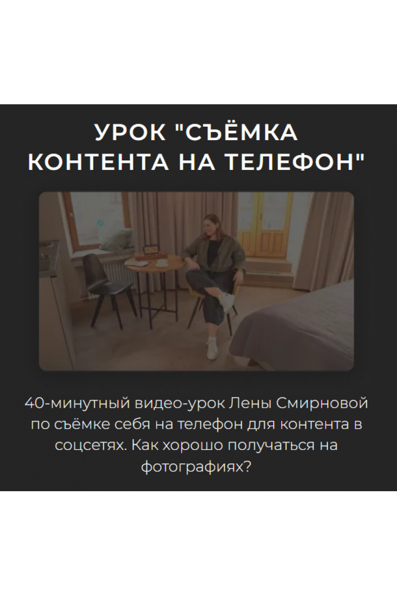 40-минутный видео-урок Лены Смирновой по съёмке себя на телефон для контента в соцсетях.