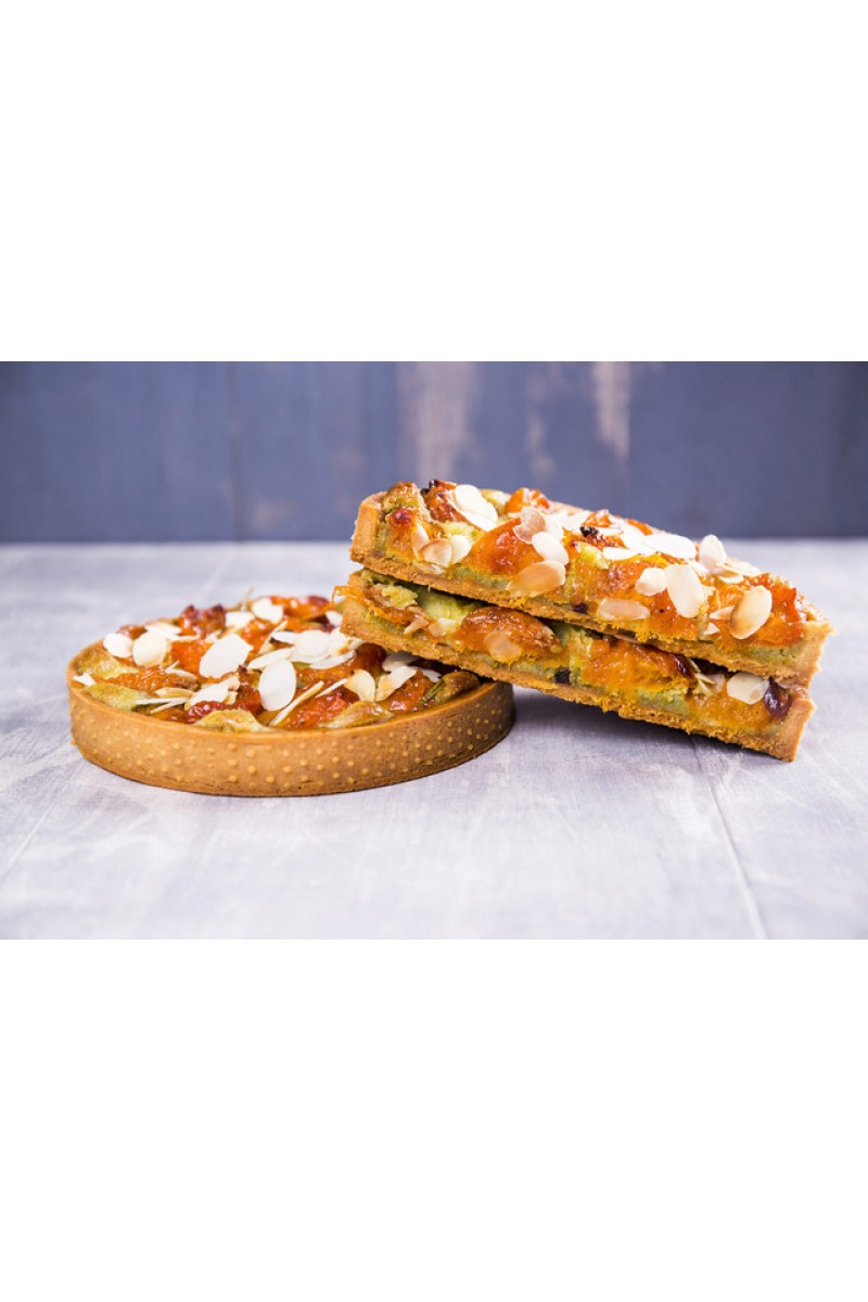 Тонкий слой песочного теста с легким послевкусием лайма обрамляет кремовую начинку из фисташкового запеченного крема «франжипан». Даже не смотря на то, что жареные абрикосы частично погружены в яркий насыщенный крем, они полностью сохраняют свою самодостаточность и свой особенный вкус, который придает им розмарин. А их кислинка отлично сочетается со сладостью фисташки и тонким вкусом лайма.