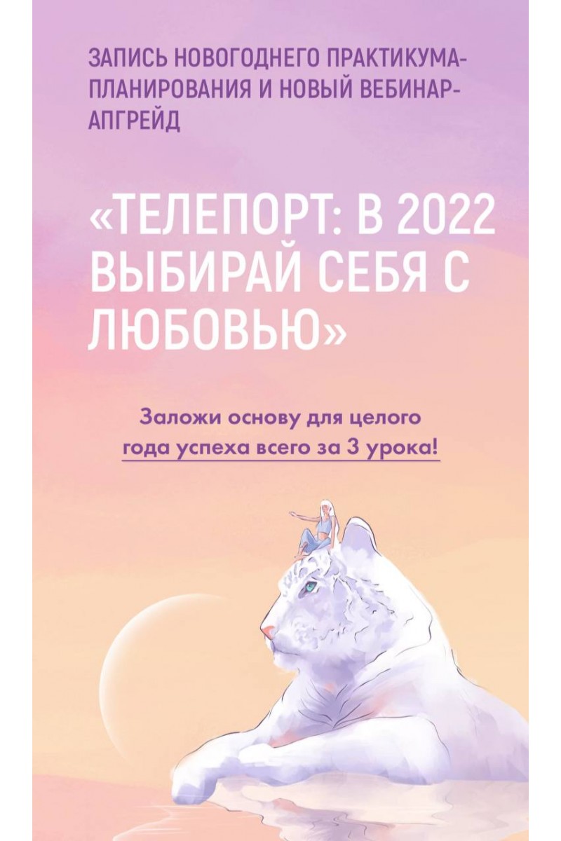 — Участие в вебинаре-апгрейде «Корректируем вектор движения на остаток 2022»— Эфир с онлайн-практикой на выбор оптимального жизненного пути и действий с энергией Архетипов Таро и его запись— Студийная запись практики на выбор оптимального жизненного пути и действий с энергией Архетипов ТароТелепорт нужен тебе, если:2021 прошёлся по тебе каткомКазалось бы, что могло быть хуже, чем 2020? Но нет, 2021 постучал со дна. Уже нет ни сил, ни веры. Кажется, что 2022 станет третьим всадником твоего личного АпокалипсисаГод прошёл… НикакОн не стал плохим, но и не принёс счастья. Ещё 365 вычеркнутых из жизни дней. А ты чувствуешь, что, наконец, готова к переменам. Не хочешь ждать подходящих событий и ситуаций. Ждешь лишь толчка, знака, напутствия, поддержки2021 стал очень хорошим годомПока другие тормозили, ты действовала и преуспела. Чувствуешь силу и энергию, а внутри есть чёткое понимание, что можешь ещё лучше! Знаешь, что это лишь 1/10 потенциала, но как достичь бо́льшего — не понимаешьТы не понимаешь, что тебе делать сейчас2022 идёт не так, как ты хочешь: вокруг много суеты, внутри нет уверенности в себе и понимания — как действовать и какие решения принимать2022 идёт неплохо, но ты понимаешь — можно лучшеВсё происходящее не вгоняет тебя в уныние, но будто бы что-то не то. Будто можно делать что-то иначе и получать больше, но как изменить стратегию — ты не понимаешь
