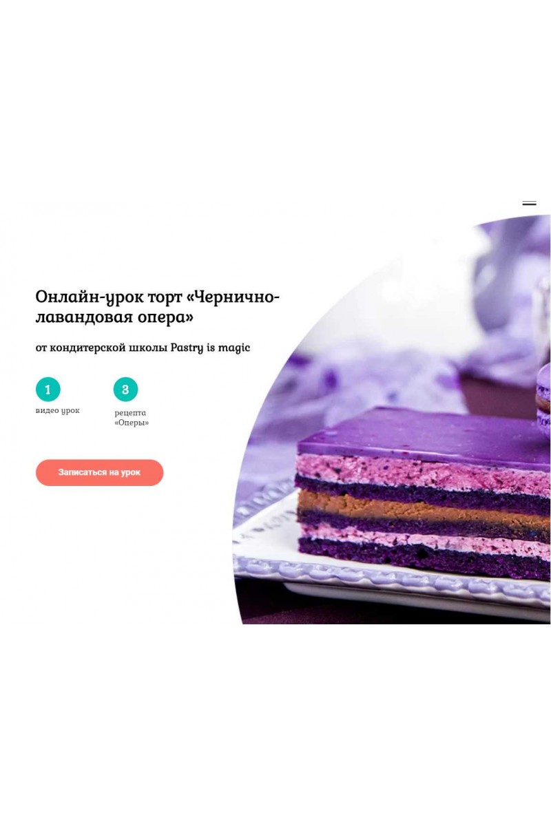 Вы получаете: ✓ Рецепт торта «Чернично-лавандовая опера» в PDF файле ✓ Рецепт торта Опера "Малина-анис" в PDF файле ✓ Рецепт торта Опера "Вишня-шоколад-красное вино" в PDF файле ✓ Видео-урок с теорией и процессом приготовления торта «Чернично-лавандовая опера»