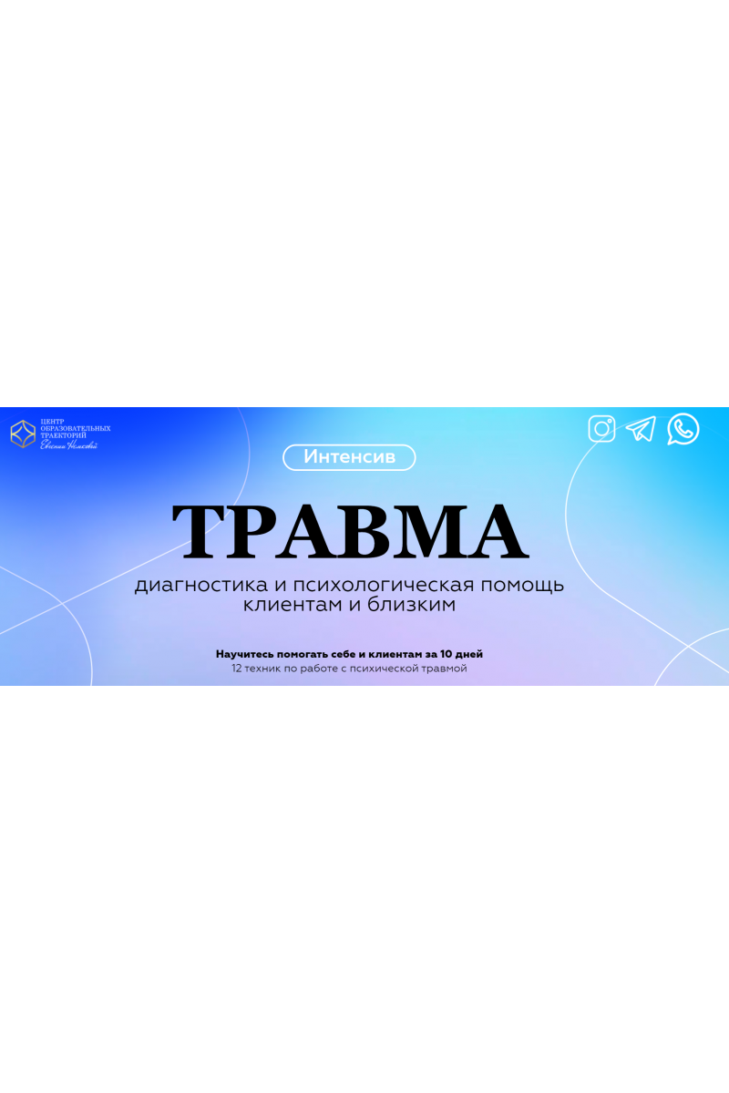 Интенсив «Травма: диагностика и психологическая помощь клиентам и близким» — это новый формат обучения, который поможет всего за 10 дней получить концентрат знаний, необходимых каждому человеку, чтобы помогать себе, близким, клиентам и окружающим людям быстро справляться со сложными эмоциональными состояниями.