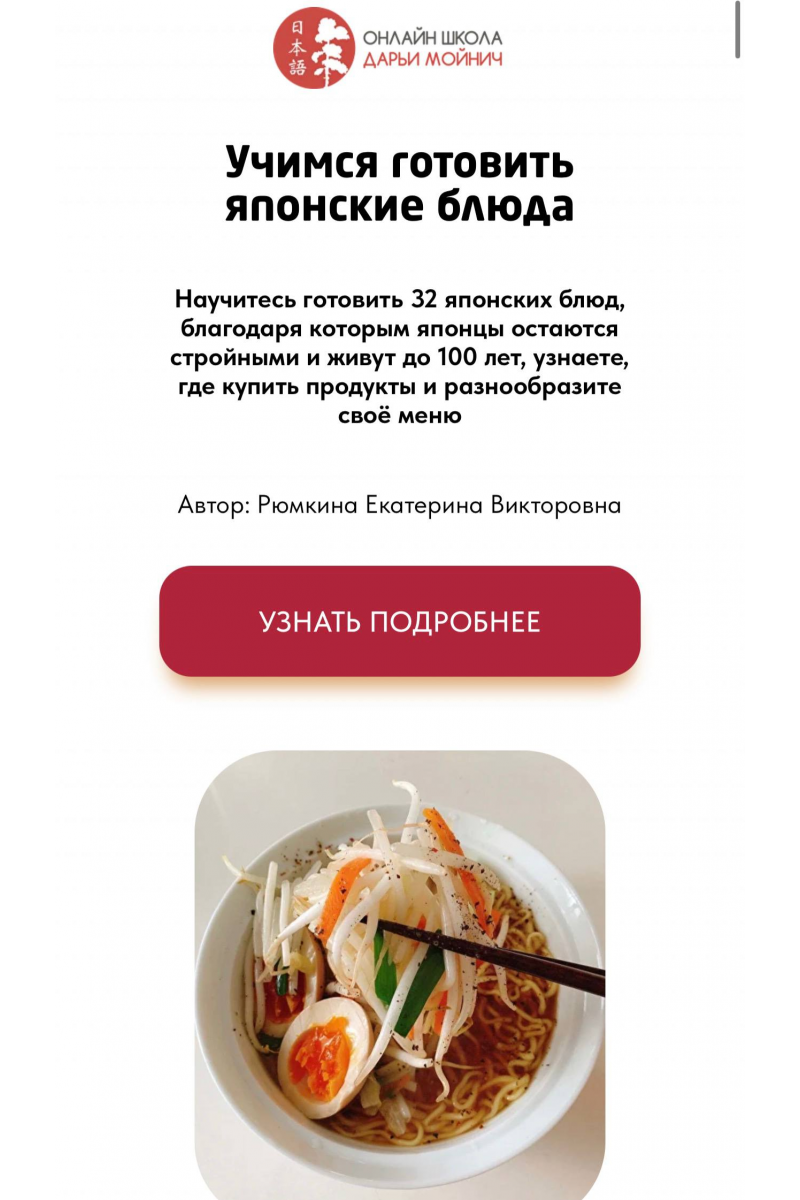 - Автор курса Екатерина ответит на ваши вопросы и поделится дополнительными рекомендациями по приготовлению японских блюд.