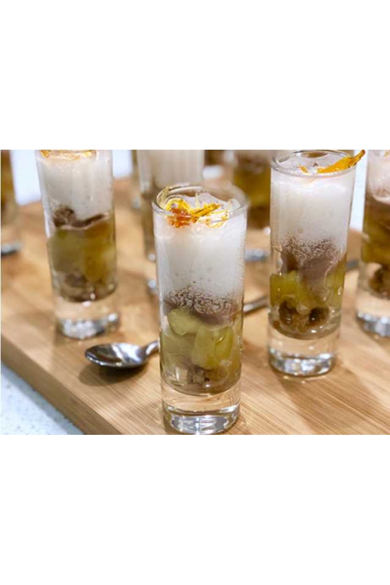 За небольшое время разбираются структуры крамбла; особенности карамелизации и фламбирования фруктов; важные моменты работы с мягкой карамелью и те элементы, которые при необходимости можно заменить в десерте на интерпретации.