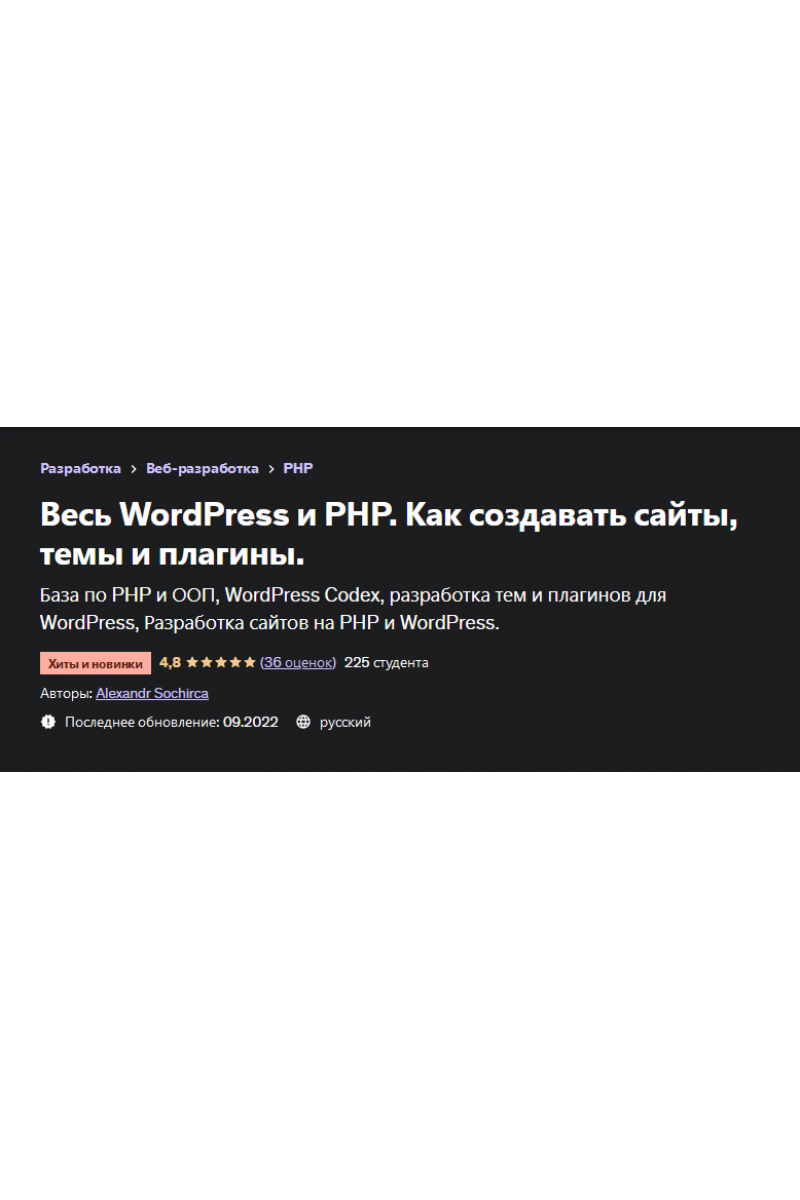 Большой курс по PHP и WordPress. Вы изучите язык программирования PHP и принципы ООП. По прохождению данного курса вы сможете разрабатывать сайты любой сложности используя WordPress CMS. Вы изучите плагин WooCommerce для разработки многофункциональных интернет магазинов. В курсе есть модули по билдерам, таких как Gutenberg, Elementor, WPBakery, SiteOrigin, Beaver Builder. Сможете разрабатывать собственные компоненты для данных билдеров используя PHP и React (JavaScript). Так же в курсе есть практический блок по разработка премиум темы для продажи на маркетплэйсах. Изучайте данный курс по WordPress и начинайте разрабатывать свой продукт на WordPress, будь то плагин или премиум тема. А так же выполняйте проекты на фрилансе или в компании применяя знания полученные в курсе.
