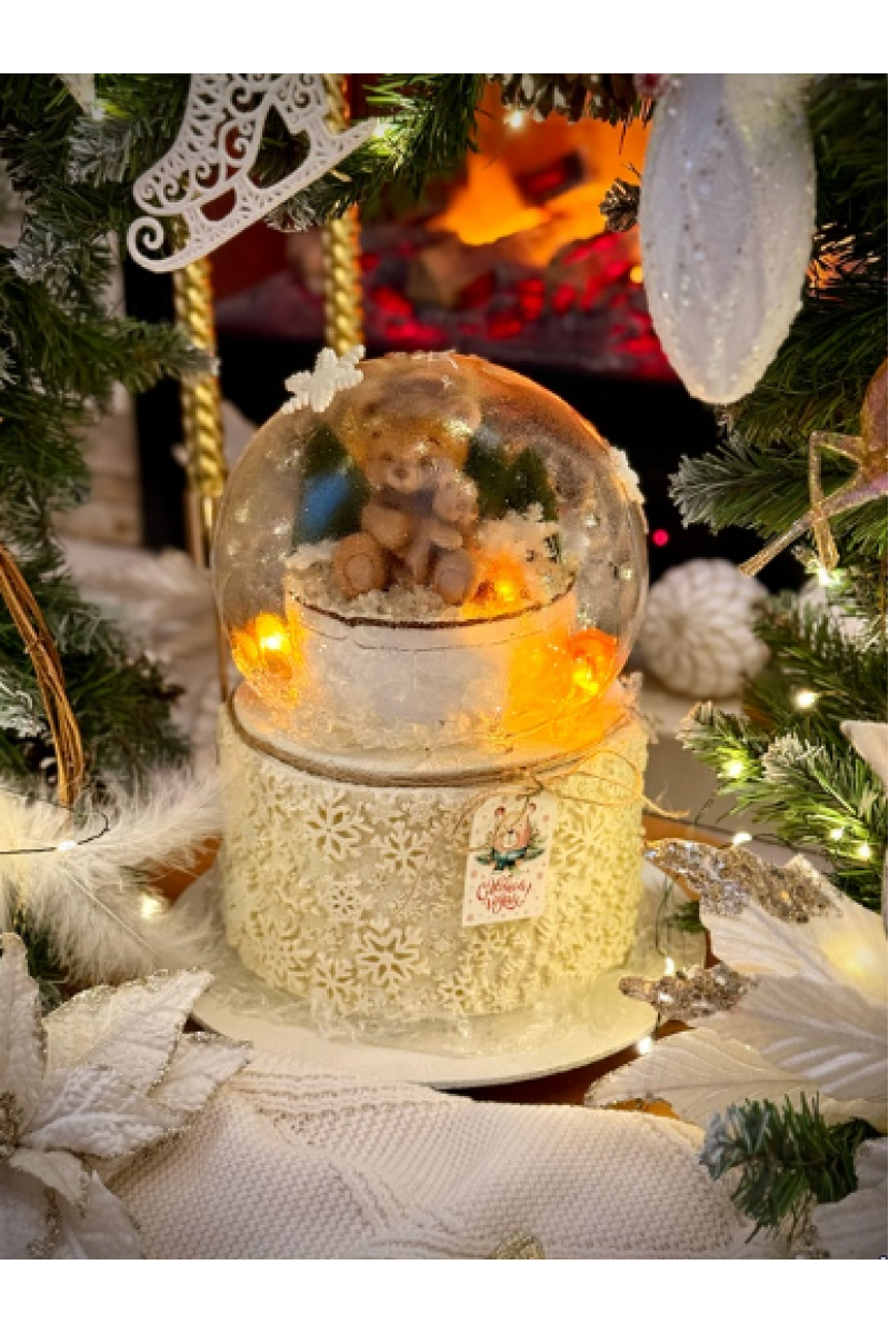 В уроке приготовим торт, сделаем необычную фактуру «снежинки», сделаем шар, поместим внутрь целую новогоднюю мимишную композицию, полностью съедобную, по вашему желанию она может вращаться
