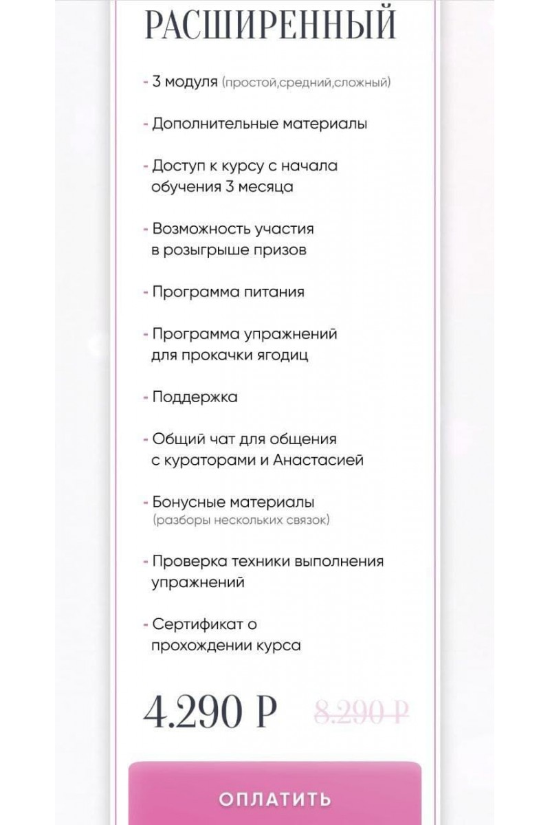 3 модуля (простой, средний, сложный)Дополнительные материалыПрограмма упражнений для прокачки ягодицПрограмма питанияБонусные материалы Разбор хореографии 3-х готовых связок