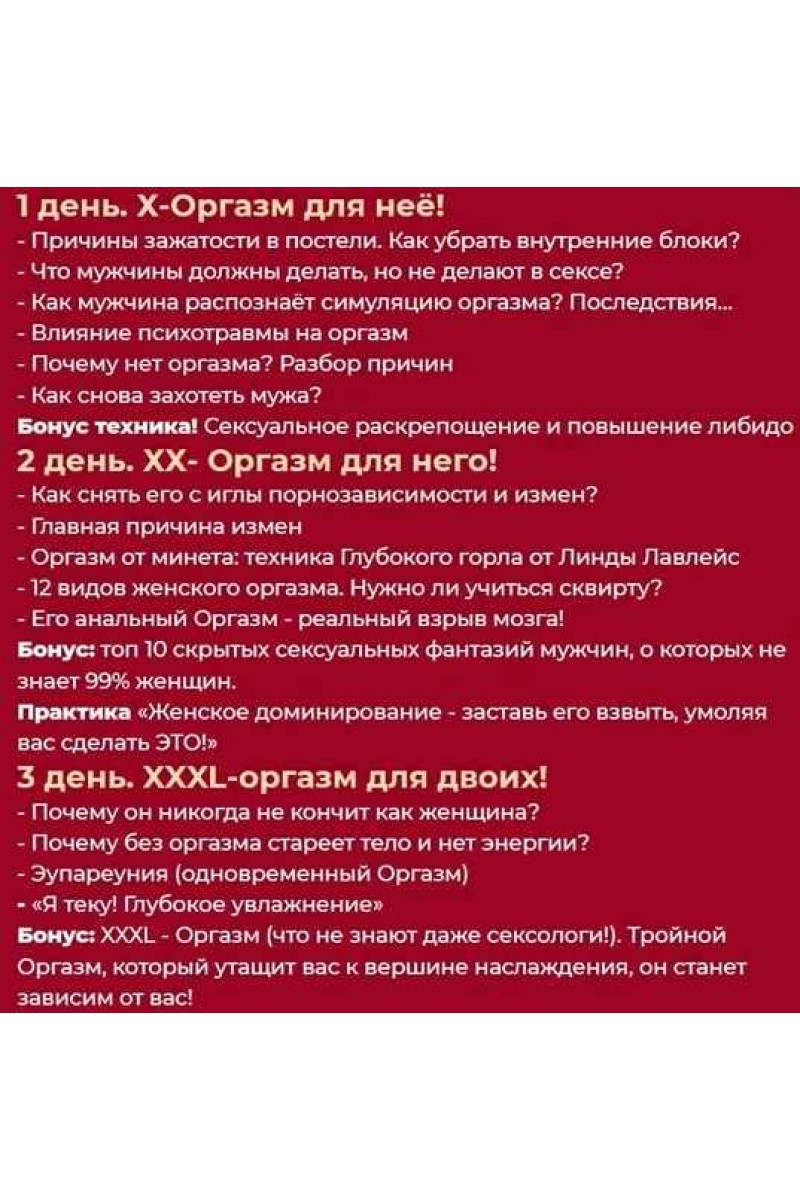 3х дневный марафон.Вы сделали правильный шаг в направлении своего совершенствования.1 деньХ оргазм для нее2 деньХХ оргазм для него3 деньХХХL оргазм для двоих