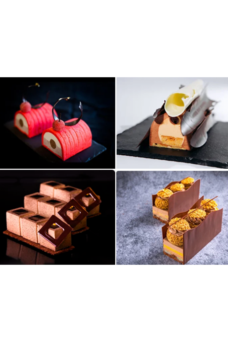 Состав: брауни с 4 видами шоколада; мусс с белым шоколадом Zephyr 34% Cacao Barry и ванилью; мусс с горьким шоколадом Cacao Barry Extra-Bitter "Guayaquil" 64% и сливочным ликером; мусс с карамелизированным белым шоколадом Zephyr Caramel 35% Cacao Barry; глазурь "Джиандуйя" и молочным шоколадом Chocolate Alunga 41%.