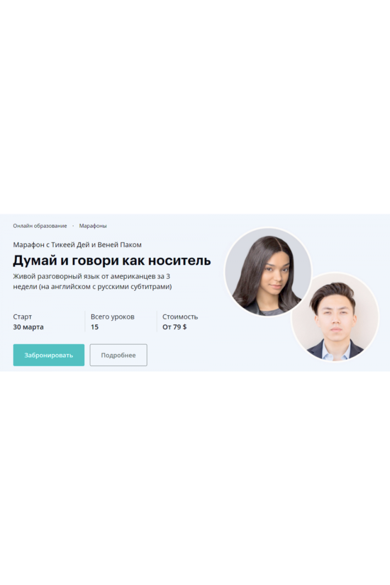 Этот марафон — ноу-хау от меня и Тикеи. Мы руководствовались простой формулой: чтобы говорить как носитель, нужно мыслить как носитель. Для этого надо слушать настоящие диалоги на актуальные темы, анализировать их и учиться выстраивать речь сразу на английском, а не переводить в голове с русского на английский. А ещё приготовили для тебя крутую новую фишку — короткие ролики с неадаптированной речью от носителя в формате влога. Это поможет тебе начать думать как носитель, что бы ни было написано у тебя в паспорте. American dream, you know.Что даст марафонЛексика из первых рукУзнаешь слова и выражения, которыми пользуются носители языка прямо сейчас, пока ты читаешь эти строчки.Никакой нудятиныБудешь заниматься без учебников и менторского тона преподавателя. Только реальные диалоги американцев, нескучные темы и творческая домашка.Немедленная практикаСразу после каждой лекции будешь выполнять забавные и практически полезные задания — потренируешься в понимании носителей.Умелый рассказчикНаучишься увлекательно и последовательно излагать свои мысли, рассказывать истории и вовлекать носителя языка в беседу. Бонусом обучим тебя эвфемизмам, которыми можно обозначить запретные вещи.Кому подходитТем, у кого уровень Intermediate+Если ты только начинаешь покорять язык, понять носителей будет непросто. Но с уверенными знаниями эта задача будет тебе по плечу.Тем, кто хочет думать и говорить как носительТебе не нужно звучать как отличник в школе. Если доверишься нам, будешь говорить естественно и непринуждённо. Будто родился в США.Тем, кому надоело выискивать живую речь в сериалахОбучаем быстро и в кайф на реальных диалогах из жизни, без инсценировок и пафоса.Тем, кто боится общаться с носителямиПереборем твой страх в два счёта.
