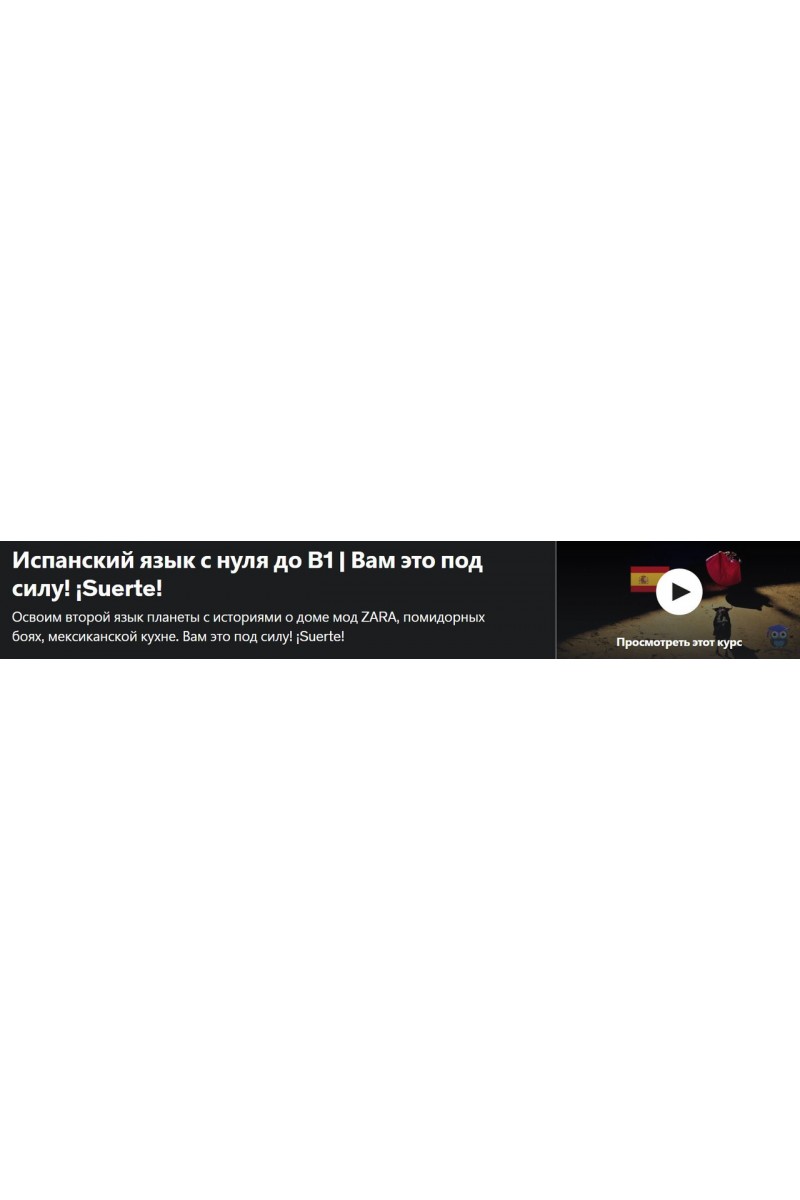 Чему вы научитесьЧитать и переводить тексты о современной жизни испанского мираВоспринимать на слух озвученные диалоги из повседневной жизниОсвоить идеальное кастильское произношениеВей необходимой для повседневной жизни грамматикеБолее 1000 слов жмвого испанского языкаИспользовать правила и лексику в жизни на примере песенТребованияВаше желание начать или продолжить изучать испаснский до уровня В1Любовь и/или интерес к испанскому миру ¡Suerte!ОписаниеОсвоим второй язык планеты с историями о доме мод ZARA, помидорных боях, мексиканской кухне. Споём песни Бандераса и Лопес! Вам это под силу! ¡Suerte!Авторская программа с самых азов, в курсе истории о жизни и культуре испанского мира с озвучкой и переводом, упражнения и карточки с новыми словами, видео-лекции с простым объяснением правил и всё это в вашем гаджете в любое время!Никаких дополнительных трат, наш курс под силу каждому, вы всегда можете вернуться к нужной теме и пройти заново неограниченное число раз – без дополнительных занятий, книг и программ.Вы экономите сотни часов и по меньшей мере 400€ в сравнении с занятиями в группе с дорогой до школы или уроками по скайпу.Свободная программа – можете перейти сразу к интересующей теме если у вас уже есть знания.Получите персональный сертификат с кодом для ваших социальных сетей!Вы сможете:Рассказать:О себе и своих панах, чувствах и стремлениях, о своих навыках и любимом сорте вина!Переписываться:С друзьями, коллегами или бизнес партнерами на испанском.Понимать:Повседневную речь полмиллиарда жителей земли, сериалы, песни, меню, шутки и важные признания...Для бизнеса и карьерыОбщаясь с испаноязычными партнёрами и коллегами на их родном языке, вы скорее получите выгодные контракты и установите благоприятную атмосферу для ведения бизнеса.Для путешествийИспанский мир откроется Вам! От диких джунглей Амазонии и тайн майя до культурного сердца Европы – Барселоны и знаменитых вечеринок на острове Ибица!Для развитияСо знанием испанского языка у вас будет отличная перспектива получить хорошее европейское образование совсем недорого. Испанцы предлагают огромное количество современной и классической литературы – Вы сможете читать книги в оригинале, многие из которых на русский никогда не будут переведены.Для кого этот курс:желающие изучать испанский язык с нуля